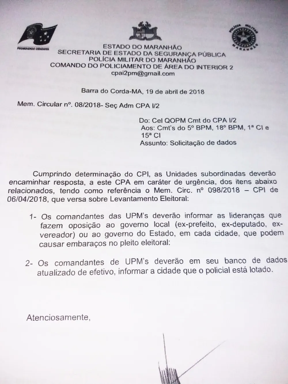 Após as cobranças, alguns comandos começaram a informar unidades subordinadas a fazer o levantamento e remeter aos Comandos de Policiamento do Interior. Nesse contexto, o major Antônio Carlos Araújo, com intuito de dar celeridade à solicitação, teria utilizado, sem autorização, a assinatura em mídia do coronel Markus e confeccionado um ofício para comandantes do 5º e 18º Batalhões de Polícia e 1ª e 15ª Comandos do Interior. Teria sido esse um dos documentos que a mídia maranhense repercutiu após ter acesso.