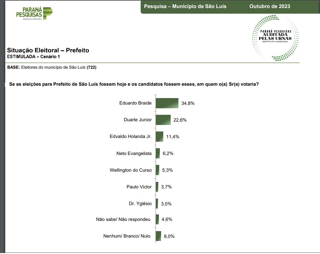 De acordo com os números, o atual prefeito Eduardo Braide (PSD) tem 34,8% contra Duarte Junior (PSB) com 22,6% das intenções de votos.