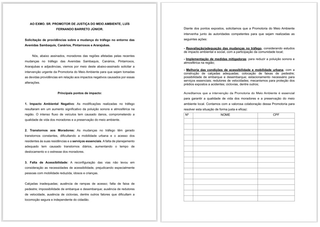 Os moradores citam “aumento significativo da poluição sonora e atmosférica na região”, dificuldades na “mobilidade urbana e o acesso dos residentes às suas residências e a serviços essenciais” e falta de acessibilidade, “prejudicando especialmente pessoas com mobilidade reduzida, idosos e crianças”, como alguns dos transtornos causados pela intervenção do programa Trânsito Livre na região do Calhau.