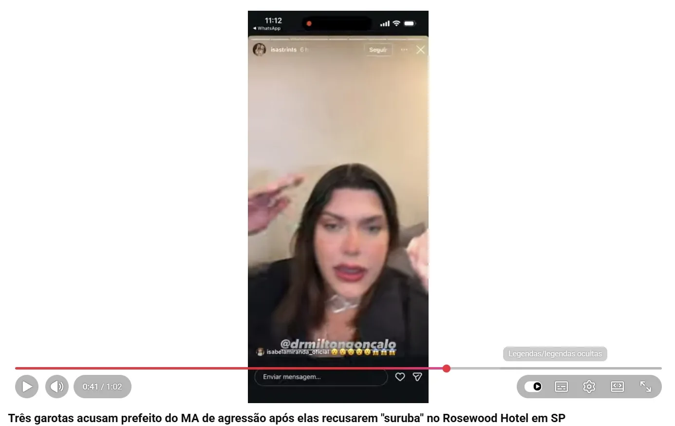 Em sua conta na rede social, Isabele Strints descreve a denúncia. “Agressão no rosewood hotel, prefeito do Maranhão @drmiltongoncalo queria obrigar eu e minhas amigas a fazer s*** com ele!”, escreveu.