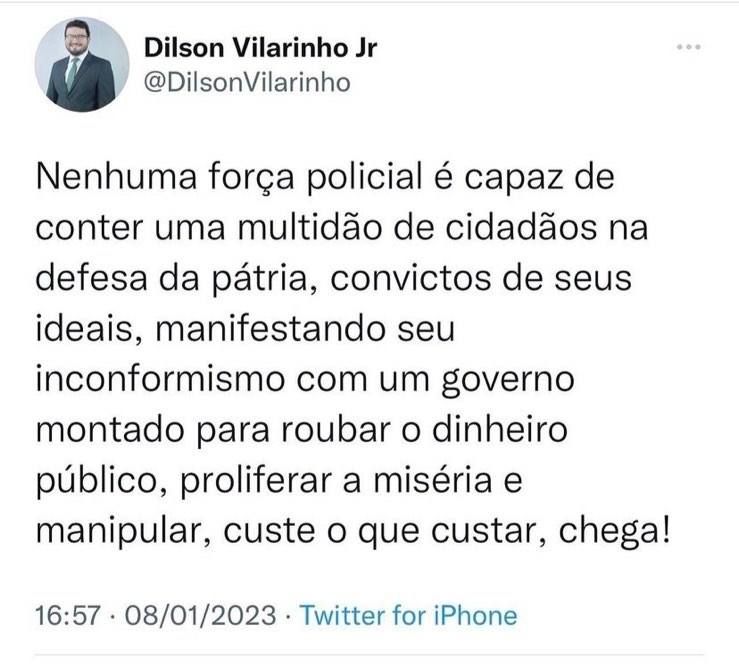 “Nenhuma força policial é capaz de conter uma multidão de cidadãos na defesa da pátria, convictos de seus ideais, manifestando seu inconformismo com um governo montado para roubar o dinheiro público, proliferar a miséria e manipular, custe o que custar, chega!”. Escreveu o vereador Didi Júnior.