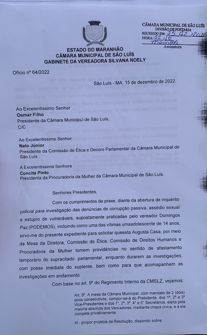 A autora do pedido é a vereadora Silvana Noely – presidente da Comissão de Direitos Humanos e Procuradoria da Mulher da Câmara Municipal de São Luís. O documento foi direcionado ao atual presidente, o vereador Osmar Filho, do PDT.