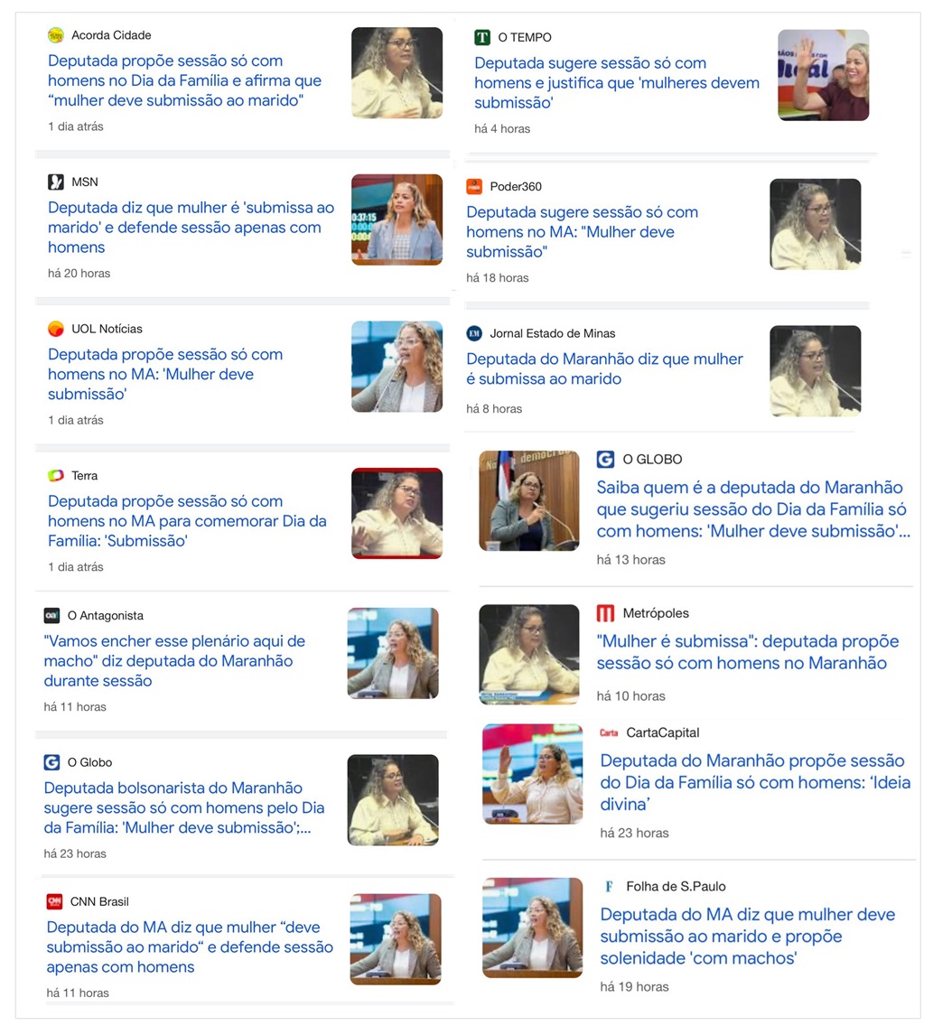 Os principais veículos de comunicação de todo o Brasil destacaram nas últimas 24h as falas da deputada estadual Mical Damasceno (PSD) que causou polêmica ao defender, na quarta-feira (17), que a Assembleia Legislativa do Maranhão (Alema) faça uma sessão apenas com a presença de homens para celebrar o Dia Internacional da Família, em 15 de maio. A ideia, segundo ela, é mostrar que o homem “é o cabeça da família”, enquanto a mulher “deve submissão ao marido”.