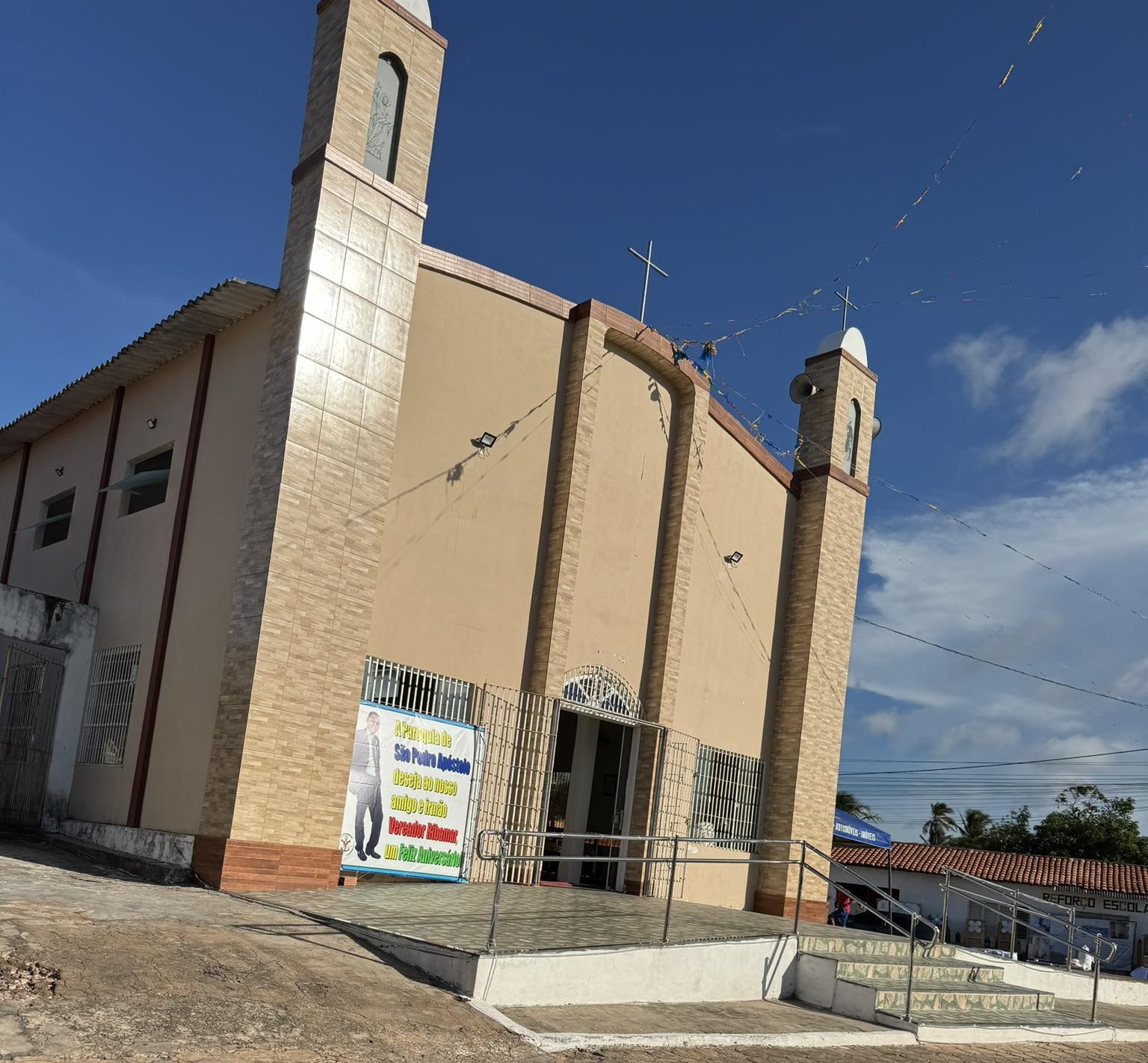 Na fachada principal, ao lado da porta da igreja católica, foi estampada uma imensa placa publicitária do vereador Ribamar. Com fotos e letras altamente coloridas.