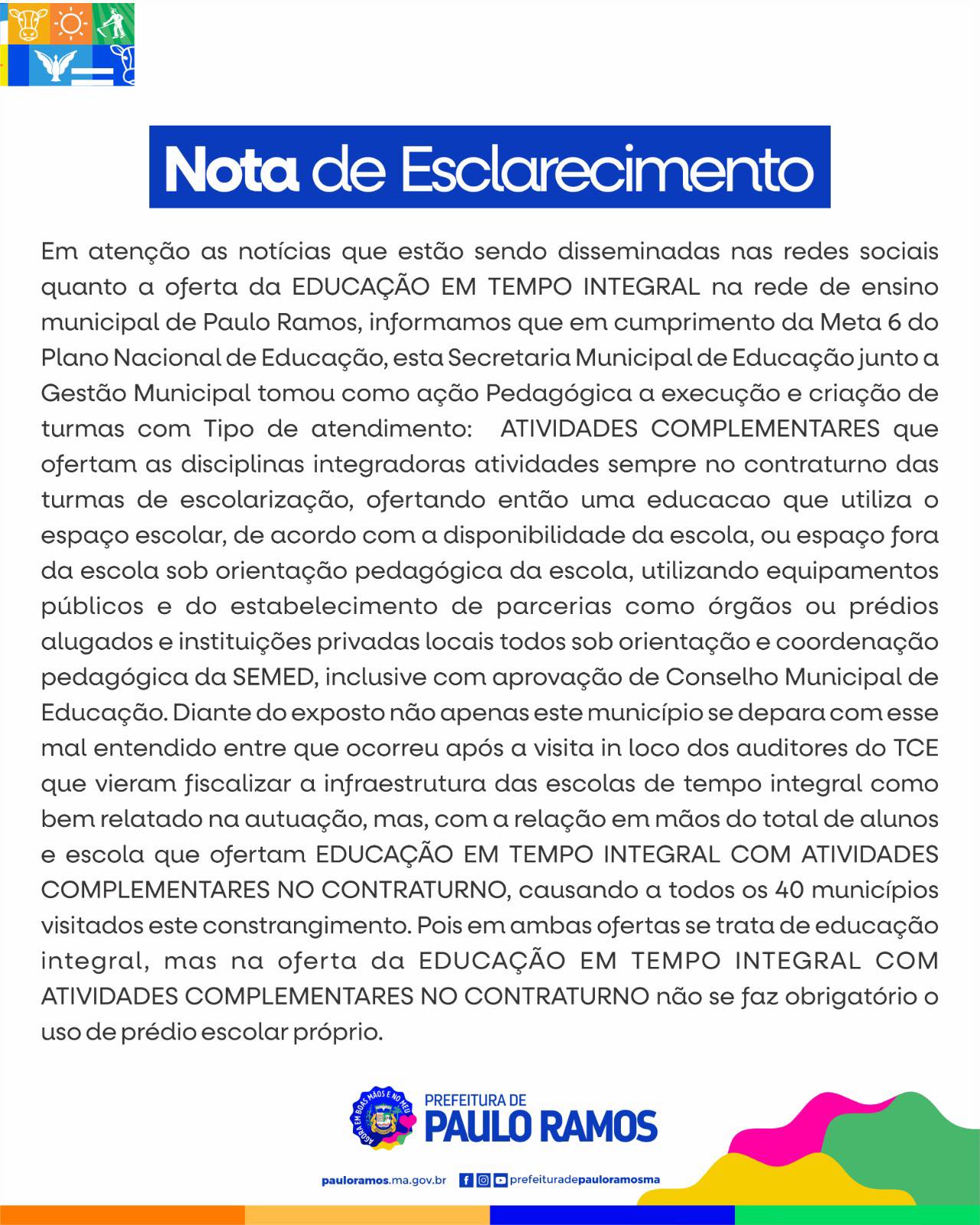 “Diante do exposto, não apenas este município se depara com esse mal entendido entre o que ocorreu após a visita in loco dos auditores do TCE-MA que vieram fiscalizar a infraestrutura das escolas de tempo integral como bem relatado na autuação, mas com relação em mãos de total de alunos e escola que ofertam Educação em tempo integral com atividades complementares no contraturno, causando a todos os 40 municípios visitados este constrangimento.” diz a nota.